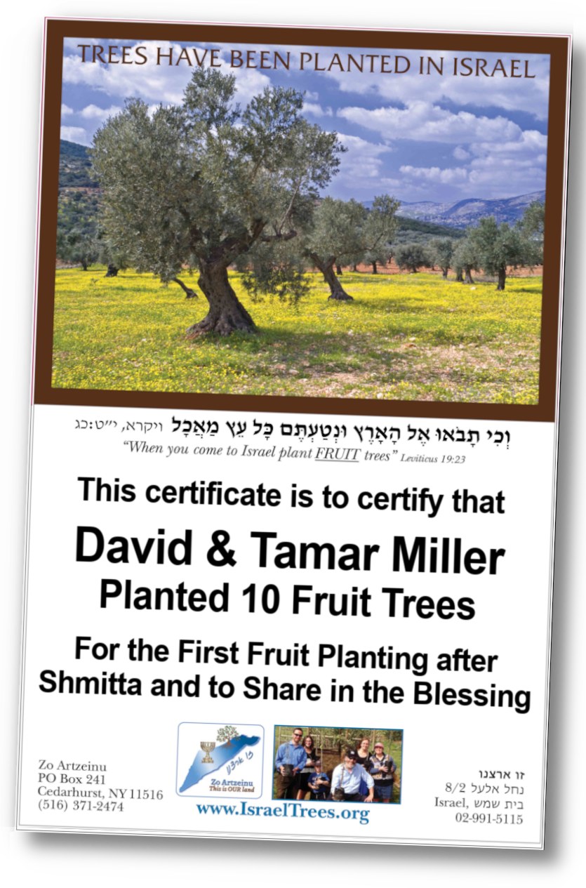 you will receive a personalized tree certificate. If you can not donate one full tree, you can still Share in the Mitzvah and Blessing and Donate any amount by clicking on the Donate Button ➞
