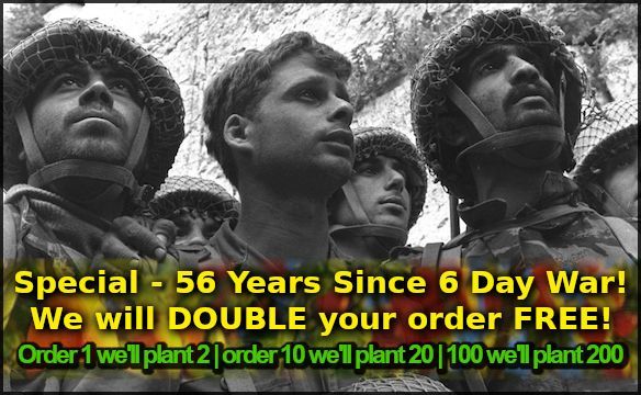With the liberation of Judea, Samaria, Golan Heights and the Jordan Valley, Israel literally DOUBLED in size! To honor that miracle – thanks to a very generous matching donor who is making this possible – we will DOUBLE your order of trees at NO EXTRA CHARGE! Order your trees, and we will plant them in the VERY places conquered in the 6 day war!