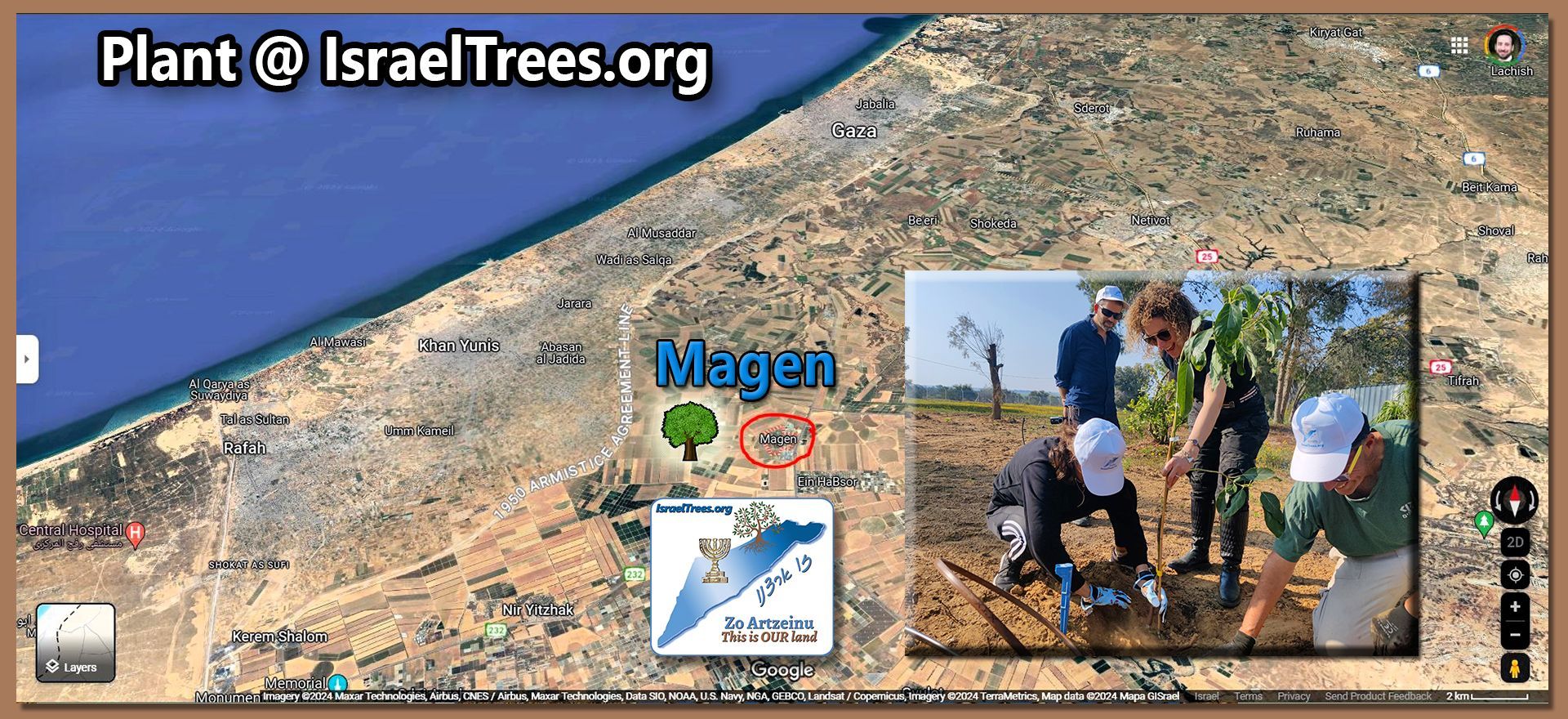 Kibbutz Magen.These trees were donated and planted by a community in LA California led by R. Elissa Ben-Naim who was on a supportive mission to Israel. They planted,