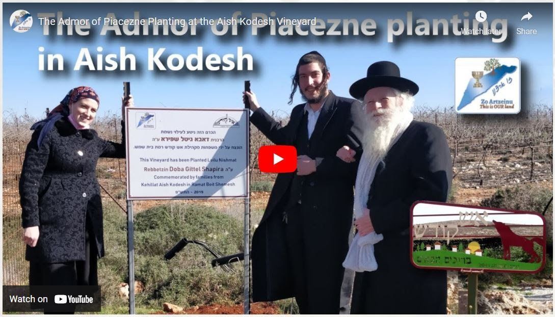 The Admor of Piacezne Rav Kalman Menachem Shapira planting fruit trees at the Aish Kodesh Vineyard with Zo Artzeinu. The Rebbe is the son of Reb Elimelech Shapira, and assumed the mantle of the Piacezne Chassidus in Ramat Beit Shemesh since his father passing in 1997.