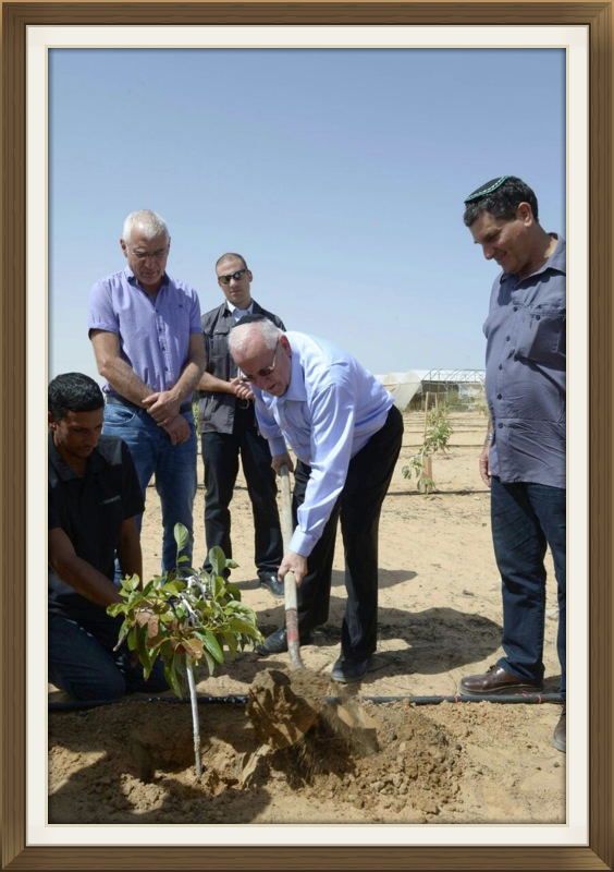 Israeli's president Rubi Rivlin planting avocado trees in Moshav Yavul in southern Israel near the Gaza boarder. The president traveled to the south of Israel to show his support for the farmers and express his admiration for them living in the Negev (desert) and turning it into a growing, thriving and productive oasis