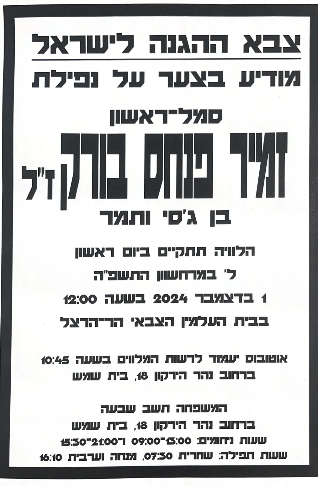 Ramat Beit Shemesh Aleph, Israel. He was drafted on December 1st 2023, and began basic training in August.